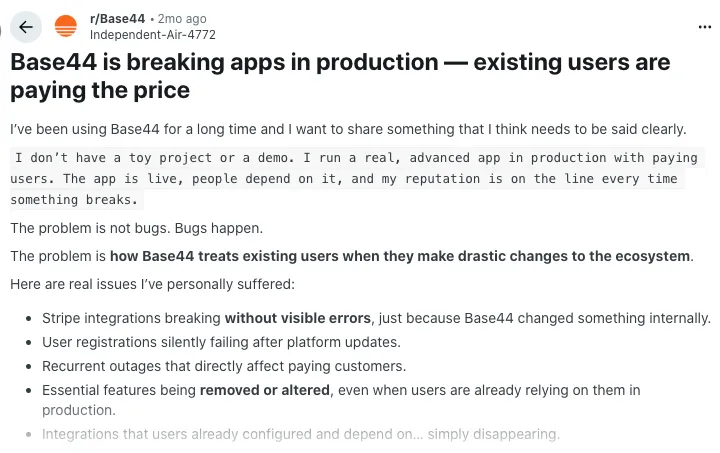 Some users report live apps failing after Base44 pushes changes behind the scenes. They mention Stripe integrations breaking, sign-ups failing silently, and outages that hit paying customers. For anyone running real revenue, that kind of instability makes Base44 feel risky as a long-term home.