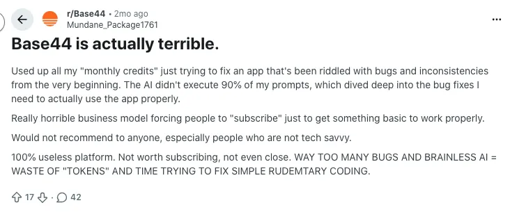Some users question whether they truly “own” their app when so much of the backend is locked inside Base44. They complain about credits that do not roll over and AI mistakes that waste both time and money. That combination of opacity and cost pushes people to look for alternatives with clearer ownership and more predictable value.