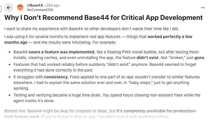 Several posts draw a line between “toy projects” and “critical apps.” Users say Base44 can be fun for snippets and ideas, but they would not trust it for core features in production. They describe stress, launch delays, and a sense that the platform is not reliable enough when stakes are high.