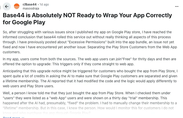 Builders trying to ship Android apps from Base44 often run into ugly surprises. One detailed thread talks about “excessive permissions” baked into the app bundle and problems separating Play Store users from regular web users. The poster’s conclusion is blunt: Base44’s mobile wrapping does not feel ready for production.