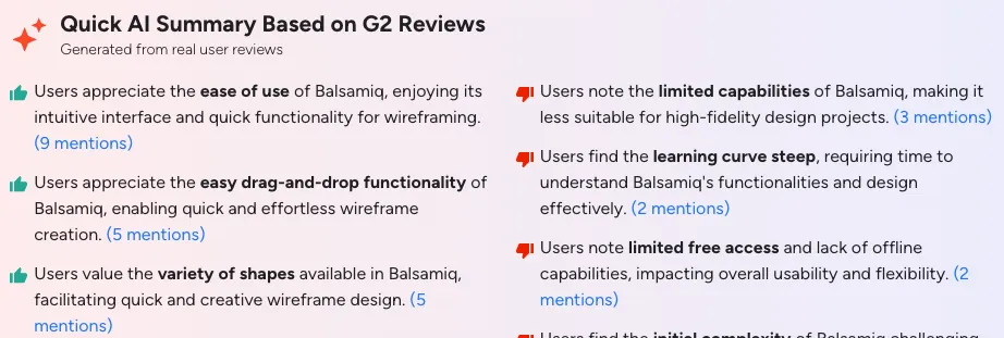 Many users like Balsamiq for rough wireframes, but they also feel it becomes limiting when projects need more polished screens or detailed UI work. G2 review summaries highlight “limited capabilities” as one of the recurring disadvantages, especially for projects that need higher fidelity output.