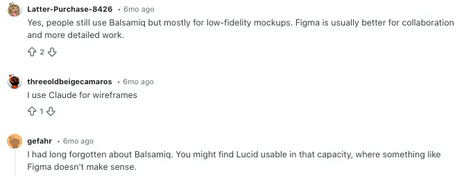 A Reddit discussion around wireframing tools shows that some users moved from Balsamiq to tools like Figma because it was easier to go from low fidelity ideas to more detailed layouts in the same workflow. That is a big reason users search for Balsamiq alternatives today. They want fewer tool switches and more room to grow inside one platform.