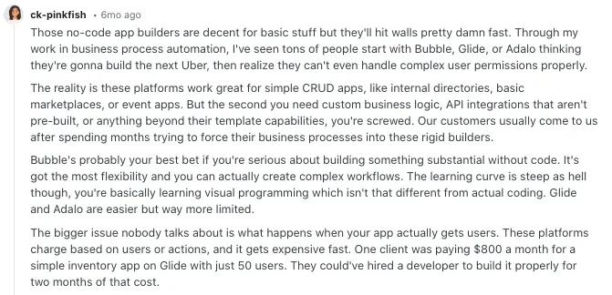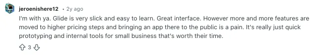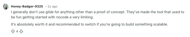 In one Reddit discussion, a builder shared concerns about whether Glide was the right platform once their project started getting serious. Another user responded with a blunt assessment: