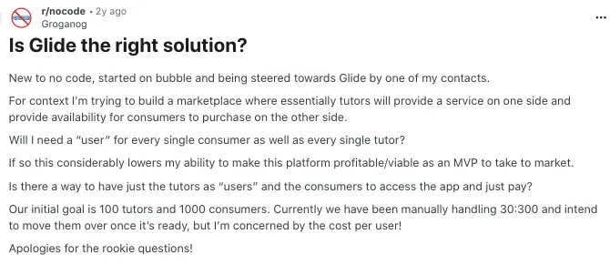 One Reddit user described how quickly costs can grow when building apps with no-code platforms like Glide: