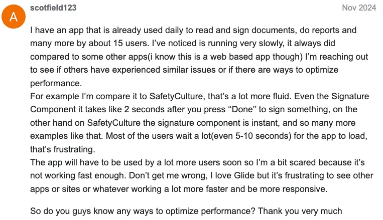 I spent time digging through Reddit threads and the Glide community forum to see what real users are saying. The pattern is pretty clear. People aren’t just looking for “another no-code builder.” They’re reacting to specific Glide limitations they ran into while trying to scale their apps.