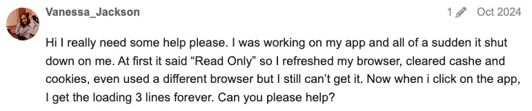 For example, one user reported that the app builder suddenly stopped loading their project entirely: