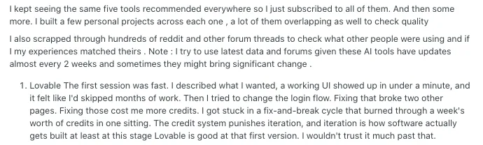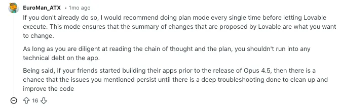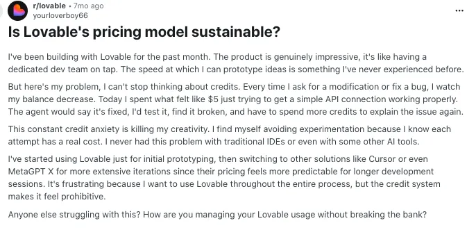 Some users say Lovable works well in the beginning, but later changes can affect parts of the app they did not intend to touch. That becomes frustrating when one fix leads to another bug, especially in larger workflows. For many builders, this creates a cycle of patching instead of building.