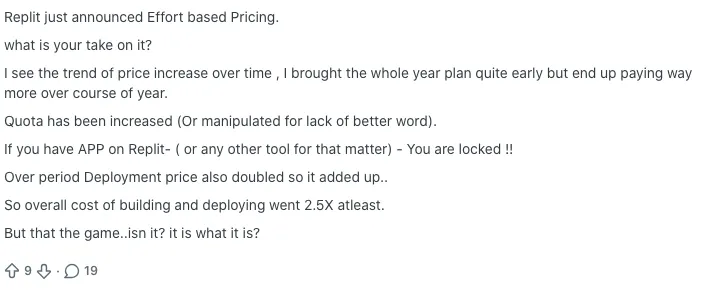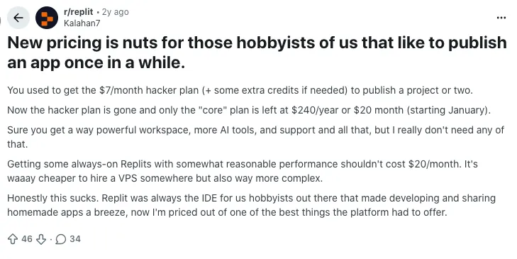 A lot of frustration comes from people who used Replit casually. One popular thread talks about the old 7 dollars per month “Hacker” plan being enough to publish a project or two. Now, the same kind of publishing requires at least the Core plan at about 20 dollars per month or 240 dollars per year, which many hobbyists simply do not need or want to pay for. They feel the new structure pushes occasional users out of the ecosystem.