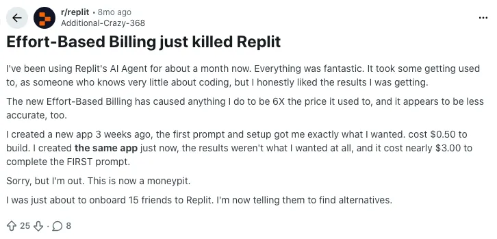 Multiple posts focus specifically on Replit’s “effort-based” pricing for the AI Agent. One user reports that after the change, the same type of app build went from about 0.50 dollars to nearly 3 dollars for the first prompt alone, and they estimate their overall usage cost increased around six times. Others say they feel forced into larger yearly plans, only to see how much value they actually get from the credits shrink over time. The common feeling: the model is powerful, but the new billing feels like a money pit.