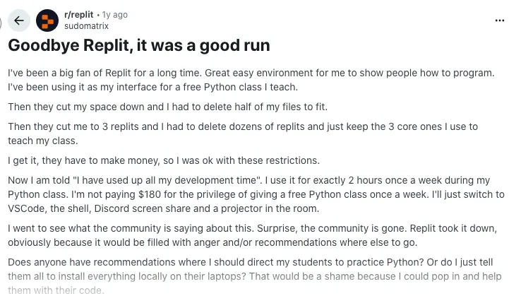 Not every post comes from a new user. One detailed story comes from someone who had used Replit for years to teach a free Python class. They liked the platform, accepted earlier cuts to storage and the free tier, and kept adapting. But after hitting new “development time” limits and facing a price tag they saw around 180 dollars just to keep teaching once a week, they decided to move their entire workflow to local tools and other online IDEs instead. The tone is disappointed rather than angry: they still think Replit is a strong tool, but no longer viable for their use case.