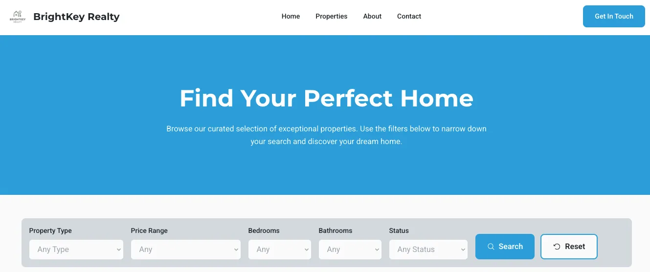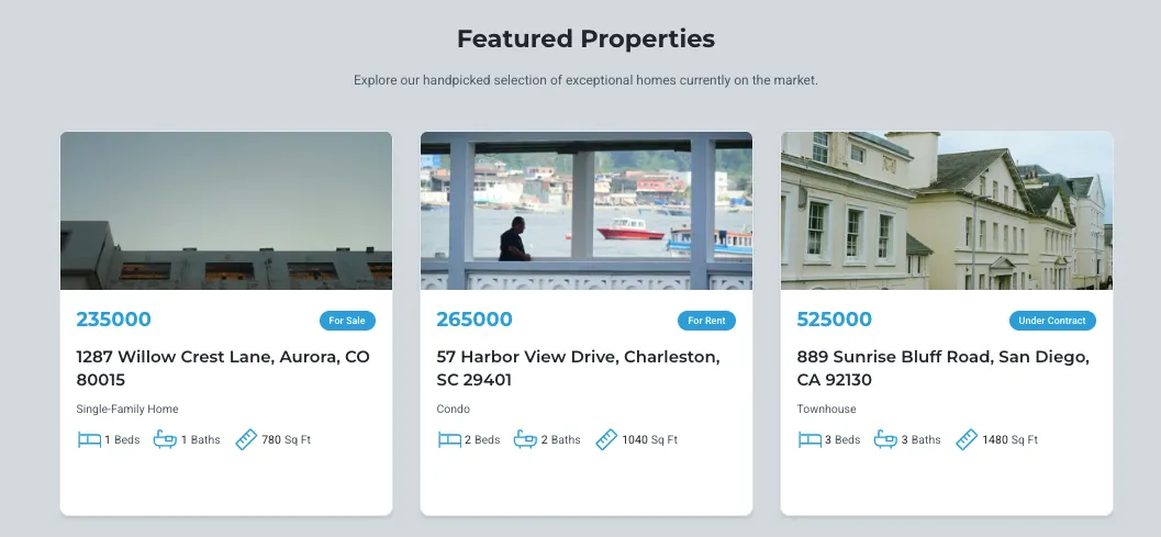 “Build a modern real estate website with a clean homepage, a property listings page, individual property detail pages, a contact page, and a simple navigation bar. The design should feel professional and easy to browse. Include responsive layout, sample images, and sample text for each section. Use clear section spacing and readable typography. The site should look ready for a real realtor.”