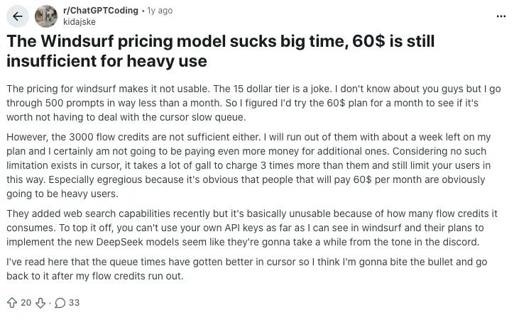 There’s a more positive take too, especially when people compare alternatives. Some users point out that Windsurf’s pricing feels cheaper or better value than other tools with similar credit systems, especially for solo devs who don’t hit high monthly usage.